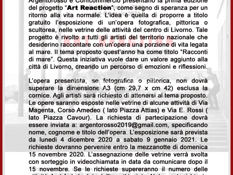 Durante l’estate abbiamo iniziato una collaborazione con la Confcommercio di Livorno, creando la sezione “Arte e Cultura”. Questa sinergia mi ha aiutato a concretizzare un progetto che avevo nel cassetto e che poteva essere utilizzato in questo momento essendo vietati gli assembramenti. Sto parlando del Progetto “Art Reaction: un segno di speranza per un ritorno alla vita normale”, cioè dare la possibilità di esporre, ai nostri soci ed a artisti esterni, nelle vetrine delle attività del centro di Livorno. Un percorso di fotografia, pittura e scultura intitolato: racconti di mare.